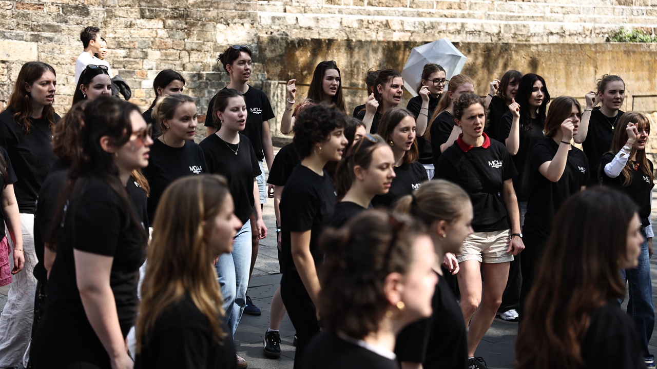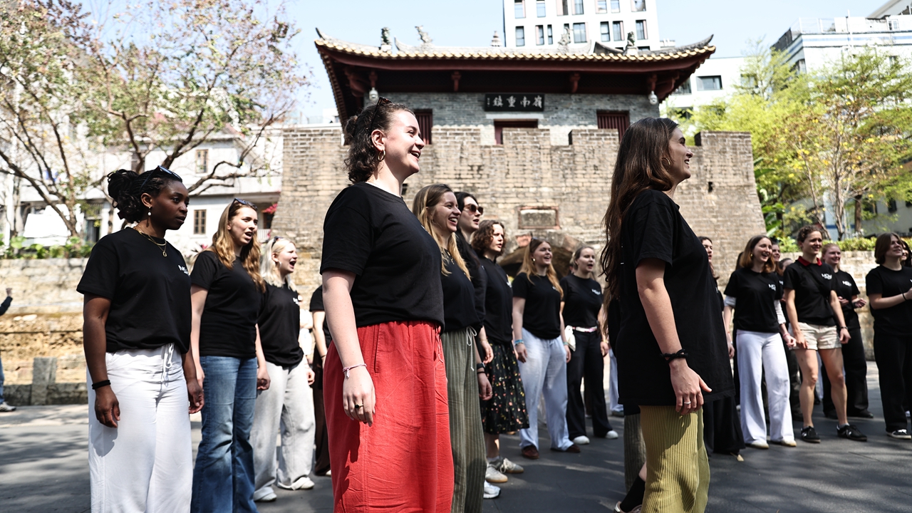 Las integrantes del Mädchenchor Hamburg, procedentes de Alemania, ofrecieron un flash mobsorpresa en la Ciudad Antigua de Nantou, en el distrito de Nanshan, y deleitan ayer al público en uno de los barrios más antiguos de Shenzhen, con casi 1.700 años de historia. Fuente: Fotos de Liu Xudong